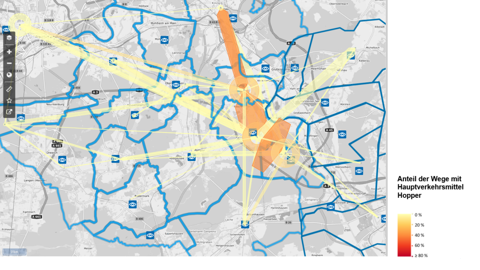 Interdependence map generated automatically from raw data. The survey was spatially limited to the district of Offenbach in Hesse, Germany. To make the real everyday mobility visible, some of the surrounding municipalities in Hesse and Bavaria can also be seen in the interdependencies in the study area. |