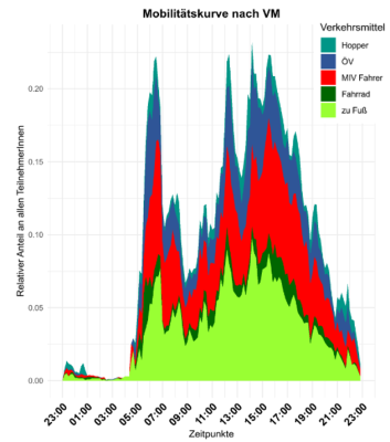 Reading example: On weekdays at 6:30 a.m., around 24% of the daily profiles show out-of-home mobility. In almost 10% of the daily profiles, people were out and about on weekdays at 2:00 p.m. |